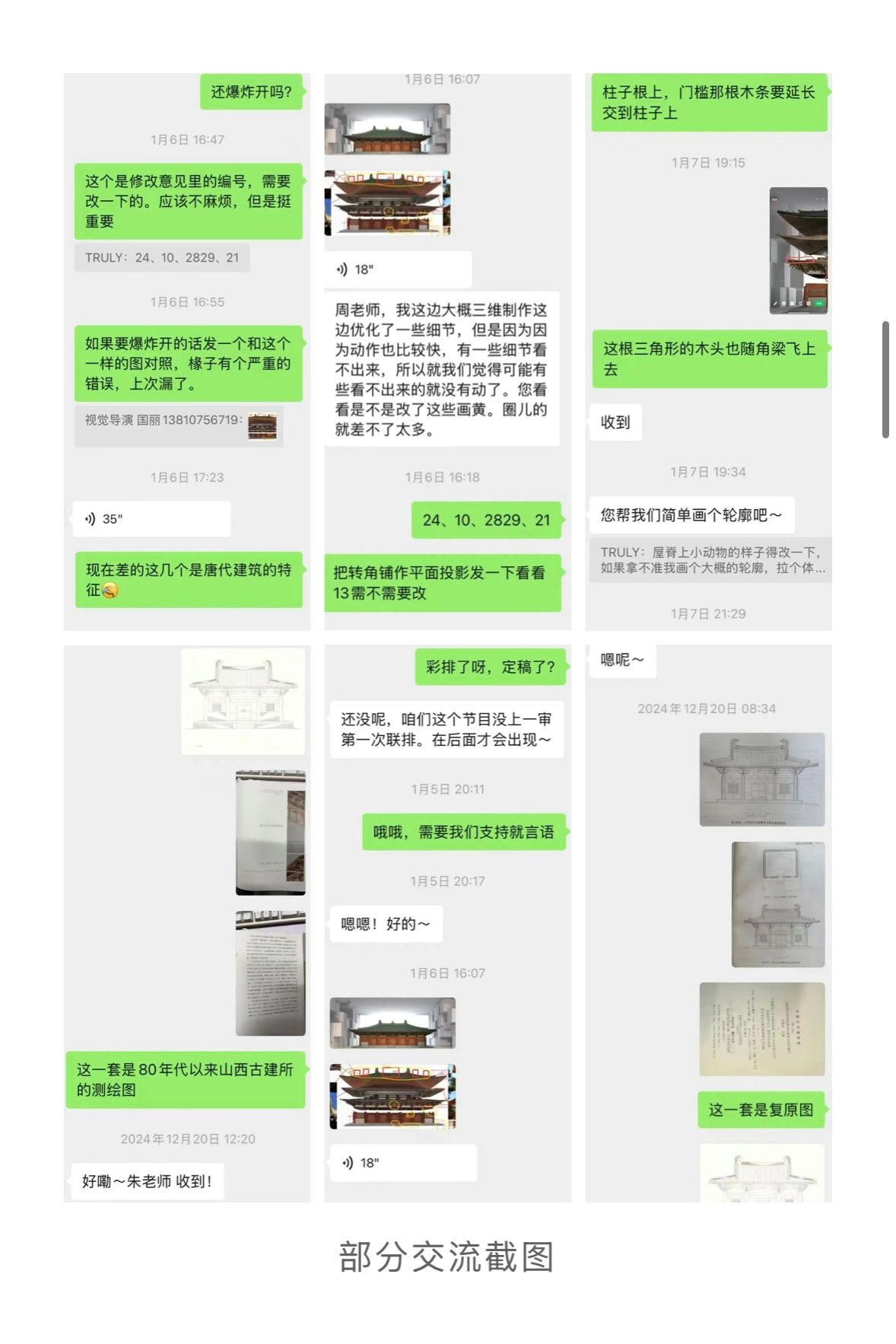 天津大学建筑学院副教授朱蕾老师讲述了与春晚团队联手的幕后故事。“央视春晚很严谨,希望节目中涉及的古建筑术语、比例尺度、结构构造都能有坚实的学术依据。距离春晚42天时,节目导演组带着脚本草稿来咨询天津大学建筑学院建筑历史与理论研究所王其亨教授研究团队。经过反复讨论,最终确定下来出镜建筑、枓栱和榫卯节点的具体内容。天大建筑学院依托延承了八十多年的古建筑研究,积累了丰富的建筑测绘成果和丰富的二维图纸和三维数字模型,以深厚的学术底蕴保障了节目创作如期高质量完成。”在《栋梁》节目制作过程中,双方在静帧上沟通了数十处修改,不断优化到节目播出前。