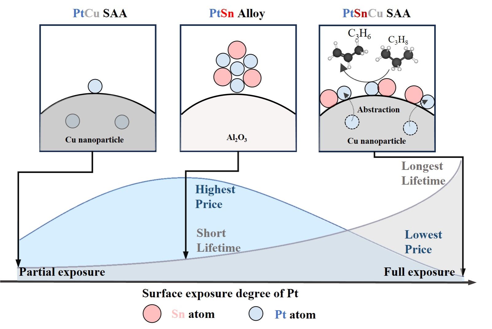 面对这一挑战,天津大学新能源化工团队在团队负责人巩金龙教授带领下,经过近十年潜心研究,开创性地研发出“原子抽提”技术:通过在铜(Cu)纳米颗粒中引入锡原子(Sn),利用Sn原子半径大于Cu使Sn偏析到表面,而Sn与铂(Pt)之间存在强相互作用可以将嵌入铜晶格内Pt 原子“抽提”至表面。该策略实现了近百分之百的贵金属原子表面分散度,并以金属态稳定存在。在丙烷脱氢工业相关反应条件下,所开发的催化剂在Pt用量仅为类商用催化剂十分之一的情况下,仍表现出相当的催化活性,并具备更优的稳定性和选择性。这项突破成功解决了丙烯产业长期面临的催化剂成本高、贵金属资源依赖强等关键瓶颈,为推动化工行业向“低耗、高效、绿色”转型提供了重要技术支撑。