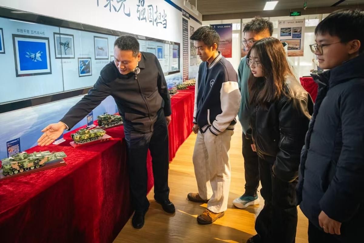 “歼-8是我国自行设计研制的高空高速战斗机。展示其模型,是为了让大家记住在2001年南海撞机事件中牺牲的‘海空卫士’王伟烈士……”“这个区域以歼-20隐身战机为引领,从首飞机型到双座协同型,中国进入‘五代机时代’,这些尖端装备共同勾勒出中国航空兵向隐身化、信息化、无人化迈进的清晰轨迹,是掌握未来战场主动权的关键依仗。”“这辆ZTL-11轮式装甲突击车是……这是今年九三阅兵中公开亮相的直-20T……”程斯宇仿佛是阅兵场上的专业讲解员,向同学们讲解着他为之骄傲的各个武器装备,言语间充满对我国强大国防军备力量的自豪。