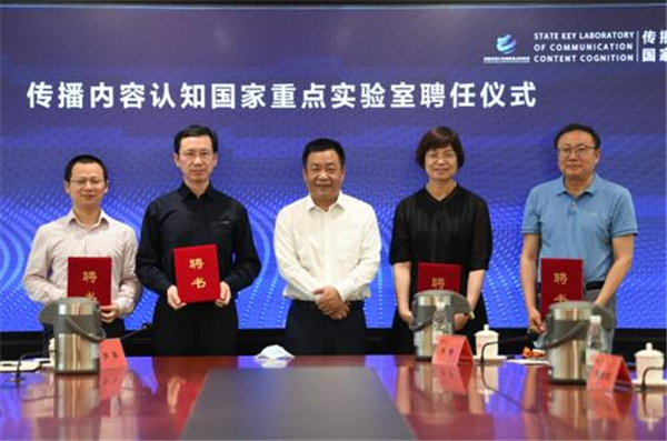实验室理事会理事长、人民日报社副总编辑许正中为传播内容认知国家重点实验室副主任颁发聘书。于凯摄