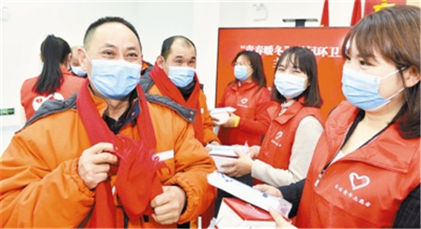 连日来,东丽团区委联合金钟街道德锦里社区青年志愿者一起为辖区内的环卫工人送上保暖围巾和水杯等生活用品,感谢他们的辛苦付出。 本报记者 刘乃文 通讯员 翟鑫彬摄