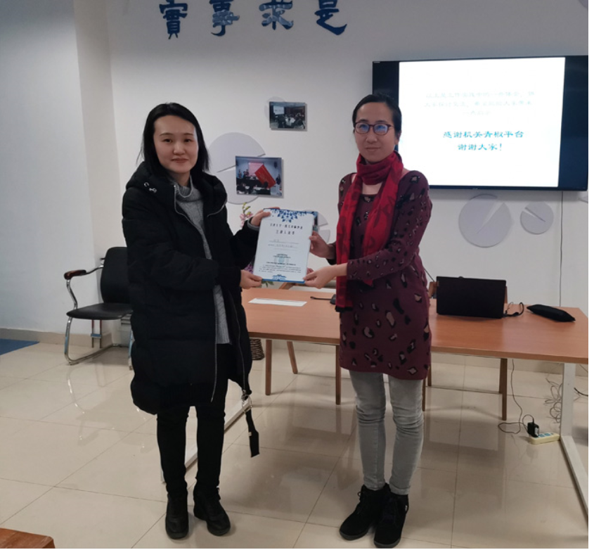 机关工会副主席元芳芳为胡萍颁发了第4期机关青椒沙龙主讲人证书。