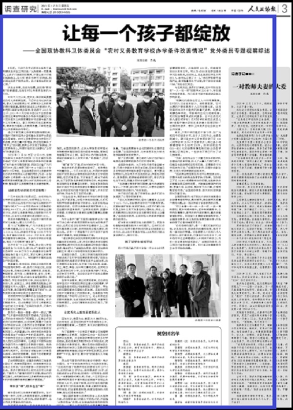 2020年11月30日至12月3日,全国政协教科卫体委员会组织15位全国政协委员组成“农村义务教育学校办学条件改善情况”党外委员专题视察团,奔赴四川省广元市和巴中市,深入考察了两个市4个县区6个乡镇的17所学校,在亲身感受农村义务教育学校办学条件取得巨大改善的同时,为进一步促进城乡义务教育一体化改革发展与城乡义务教育资源均衡配置,努力办好优质的农村义务教育、整体提升义务教育发展水平建言献策。