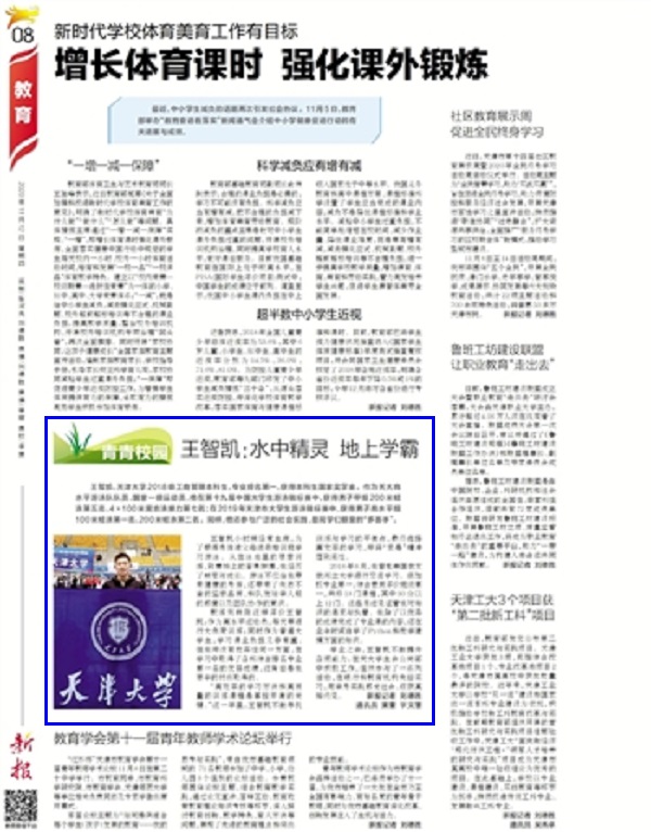 新报讯 【记者 刘德胜 通讯员 黄蕾 宇文慧】王智凯,天津大学2018级工商管理本科生,专业排名第一,获得本科生国家奖学金。作为天大高水平游泳队队员、国家一级运动员,他在第十九届中国大学生游泳锦标赛中,获得男子甲组200米蛙泳第五名、4×100米混合泳接力第七名;在2019年天津市大学生游泳锦标赛中,获得男子高水平组100米蛙泳第一名、200米蛙泳第二名。同样,他还参与广泛的社会实践,是同学们眼里的“多面手”。