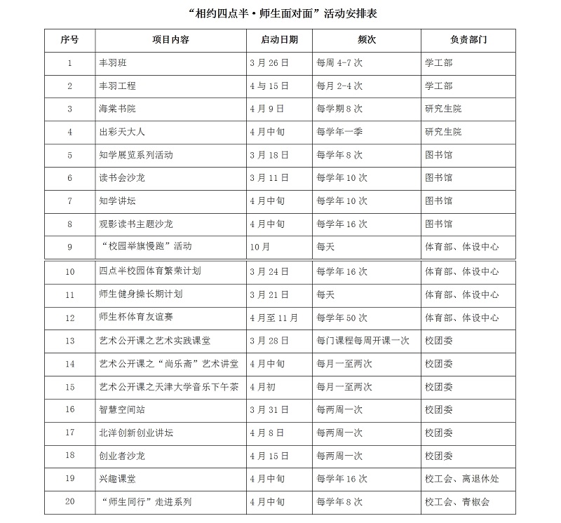 据主办方介绍,活动时间安排在下午四点半到晚上八点,邀请老师们主动参加到学校组织的各式各样的文体活动中。希望在北洋园新校区形成“老师就在你身边”的氛围,让教师的身影充实新校区,培养学生,影响学生。