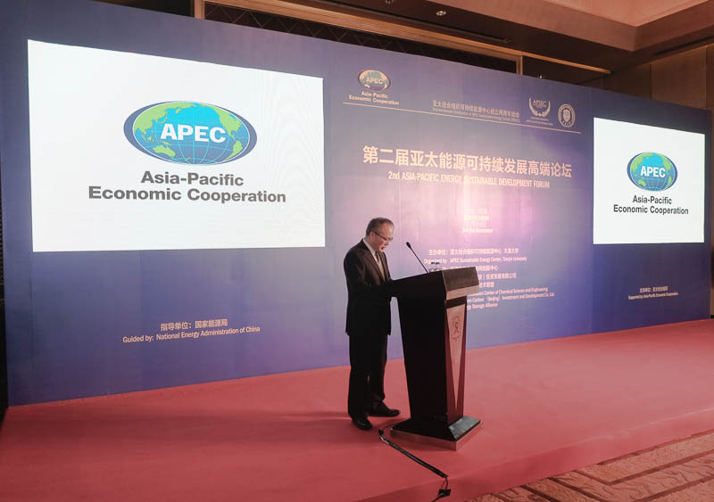 本站讯(通讯员 卢金 黄炜)11月3-5日,APEC可持续能源中心(APSEC)在天津瑞吉金融街酒店举行“第二届亚太能源可持续发展高端论坛”暨成立两周年庆祝活动,同期召开了APSEC第二次指导委员会会议。APEC能源工作组(EWG)新任主席、16个APEC经济体官方代表、EWG下设的3个专家组(新能源与可再生能源专家组EGNRET、清洁化石能源专家组EGCFE、能效专家组EGEE&C)和1个任务组(能源弹性ER-TF)的代表以及独立专家近百名国际人员参会,国家能源局、天津市发展改革委、科委和建委等领导前来参会。出席会议的还有几十家国内知名企业和地方政府代表。天津大学党委书记李家俊出席会议并讲话,校长钟登华出席欢迎晚宴并致辞,我校人文社科处、国际合作处、建筑学院、化工学院等相关部门负责人参加会议。新华社、天津电视台等媒体对论坛进行了报道。
