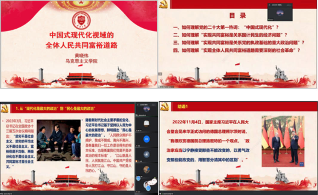 活动邀请到马克思主义学院教师黄晓伟为与会党员做题为《学习二十大精神之“中国式现代化视域的全体人民共同富裕道路”》的主题宣讲。黄晓伟从学好党的二十大精神要着重把握的“九个深刻领会”切实展开,就如何理解党的二十大第一热词“中国式现代化”、如何理解“实现共同富裕是关系国计民生的经济问题”、如何理解“实现共同富裕是关系党的执政基础的重大政治问题”以及如何理解“实现全体人民共同富裕道路需要深刻的社会革命”四个问题进行了深入浅出的讲解,对与会党员深入学习党的二十大报告,切实领会中国式现代化的核心特征,全面把握新时代十年伟大变革的深刻内涵和重大意义具有很好的引领和指导作用。