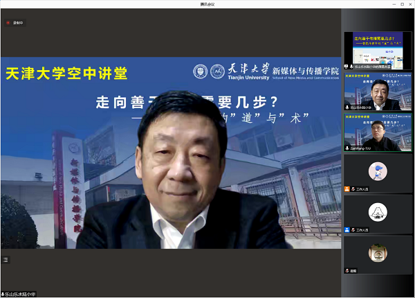 本站讯(新媒体学院供稿)2022年1月20日下午,天津大学新媒体与传播学院“以文化人,同心战疫”空中课堂顺利举办。作为天津大学空中讲堂系列的一部分,在本次讲堂中,天津大学新媒体学院院长、享受国务院政府特殊津贴专家、全国新闻出版行业领军人才陆小华教授以“走向善于传播需要几步?——智能传播中的‘道’与‘术’”为主题,为校内外数百名师生带来了一场精彩的讲座。本次空中讲堂由新媒体与传播学院副院长王赞主持。