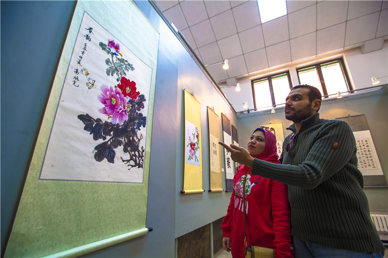 留学生观赏天津大学王学仲艺术研究院书画展览 赵习钧摄