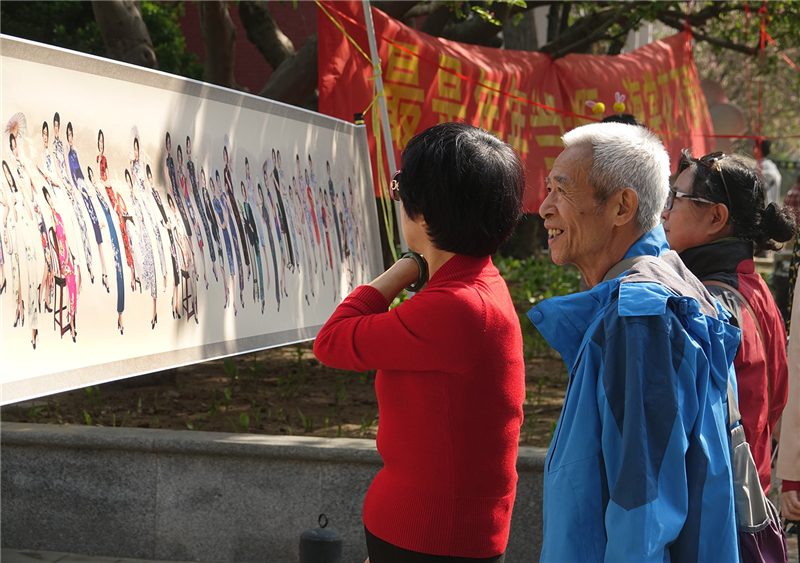 游人驻足观赏“旗袍·书香·雅韵”海棠季人物摄影长卷展 王建泽摄