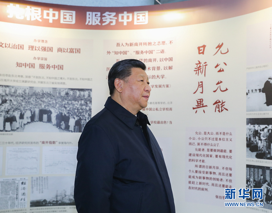 17日上午,习近平来到天津南开大学考察调研。南开大学成立于1919年,是一所具有光荣爱国传统的名校。习近平参观了校史展览,详细了解南开大学历史沿革、学科建设、人才队伍、科研创新等情况。习近平指出,学校是立德树人的地方。爱国主义是中华民族的民族心、民族魂,培养社会主义建设者和接班人,首先要培养学生的爱国情怀。高校党组织要把抓好学校党建工作和思想政治工作作为办学治校的基本功。习近平同在现场的部分院士、专家及中青年教师代表进行了交流。他指出,专家型教师队伍是大学的核心竞争力。要把建设政治素质过硬、业务能力精湛、育人水平高超的高素质教师队伍作为大学建设的基础性工作,始终抓紧抓好。在元素有机化学国家重点实验室,他强调,要加快一流大学和一流学科建设,加强基础研究,力争在原始创新和自主创新上出更多成果,勇攀世界科技高峰。他勉励师生们把学习奋斗的具体目标同民族复兴的伟大目标结合起来,把小我融入大我,立志作出我们这一代人的历史贡献。走出实验室,广场上挤满了学生,大家高呼“总书记好”、“总书记辛苦”,齐声高喊“爱我中华、振兴中华”,还唱起《我和我的祖国》。习近平同近处的同学亲切握手,向远处的同学们招手致意。掌声、歌声、欢呼声在校园里久久回荡。