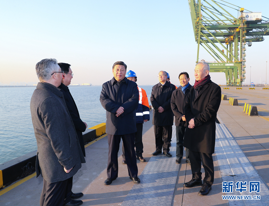 1月16日至18日,中共中央总书记、国家主席、中央军委主席习近平在京津冀考察,主持召开京津冀协同发展座谈会并发表重要讲话。这是1月17日下午,习近平在天津港码头考察。 新华社记者 鞠鹏 摄
