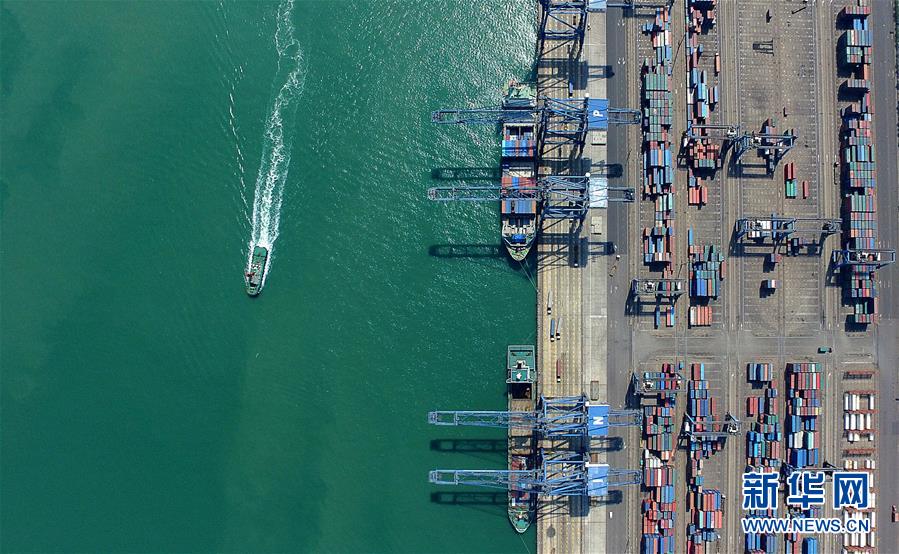 船舶在湖北武汉阳逻港区水域行驶(2018年8月13日无人机拍摄)。新华社记者 肖艺九 摄