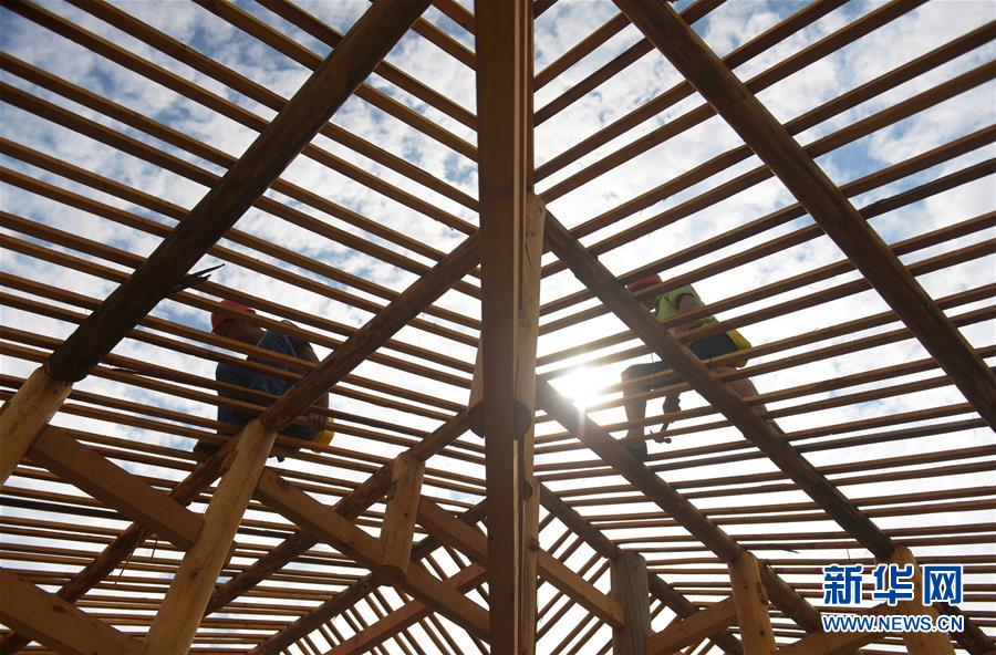 在湖北省宣恩县晓关侗族乡,工人在建设吊脚楼(2018年7月26日摄)。2018年,当地政府开始修建6座新的侗寨吊脚楼,为符合易地搬迁政策的贫困户实施搬迁。新华社发(王俊 摄)
