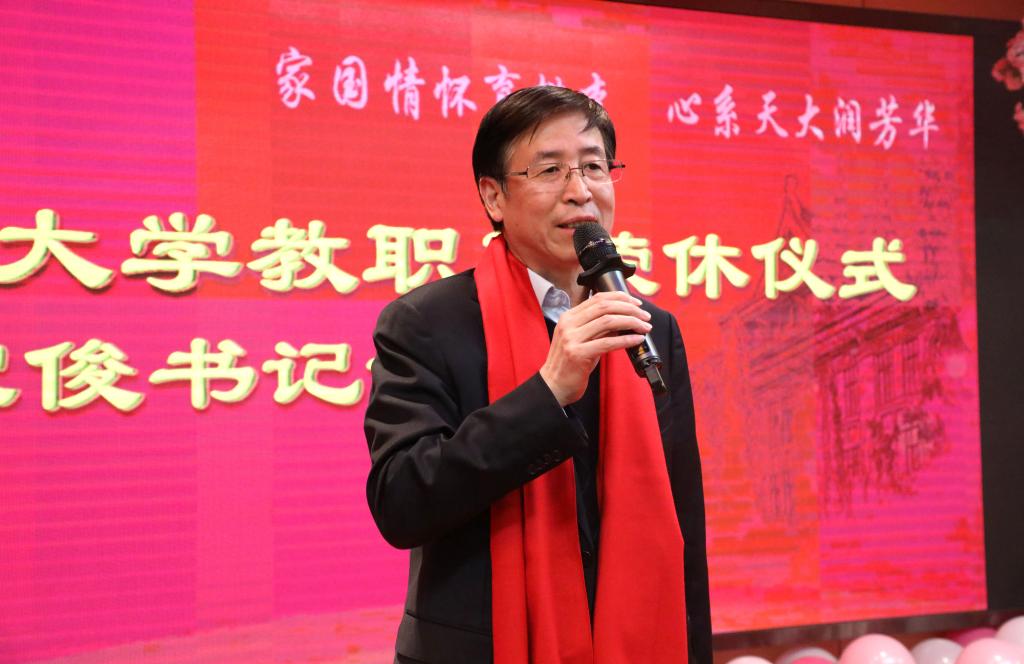 李家俊代表学校向即将离退休的114位教职工表示祝贺,对他们多年来的无私奉献表示感谢。他从教学和科研两个方面简要回顾了学校2018年取得的成果。在教学方面,学校不断加强一流本科教育建设,顺利完成教育部本科教学审核评估工作,获得专家组高度评价;持续引领新工科建设,贡献“天大智慧”、发出“天大声音”,教育部、天津市等5个“新工科”教育机构在天大揭牌;入选教育部“三全育人”综合改革试点高校,贯彻落实“三全育人、五育并举”要求,全面提高人才培养能力。在科研方面,学校科研经费突破30亿元,SCI论文突破4000篇;元英进教授团队完成的“酵母长染色体的精准定制合成”成果入选“2017年度中国科学十大进展”,天大合成生物学前沿科学中心作为教育部立项建设的7个前沿科学中心之一获批立项建设;钟登华院士牵头的大型地震工程模拟研究设施由国家发改委批复立项,这是我国地震工程领域首个国家重大科技基础设施。他表示,成绩的取得不是一朝一夕的,学校的每一项成就都离不开一代又一代天大师生的辛勤付出,都凝聚着全体离退休教职工的智慧和汗水。