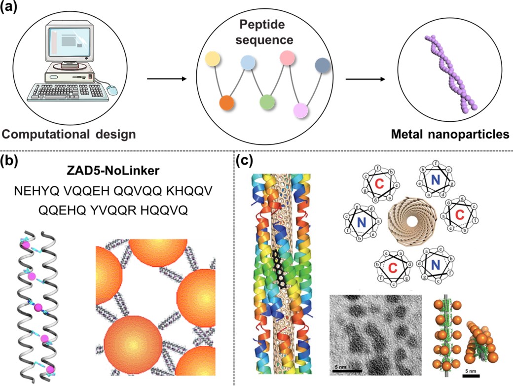 此外,通过与人工智能相结合,研究人员能够利用计算机理性设计构成多肽的氨基酸序列,精确控制多肽与无机物之间的相互作用和组装方式(图3)。例如,通过精确设计多肽分子中疏水氨基酸残基的位置,具有α-螺旋构象的多肽分子能够在碳纳米管表面有序组装,并诱导金纳米团簇在其外表面进一步矿化,形成自然界中无法得到的多级精细结构。
