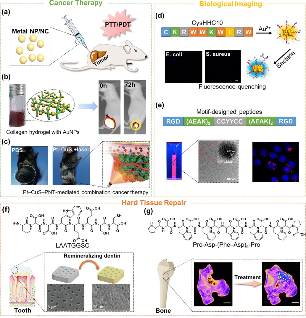 以多肽为模版,通过仿生矿化形成的金属团簇,由于具有荧光特性、靶向性和独特的生物学功能,已在癌症治疗和生物成像中广泛应用(图5)。通过在多肽水凝胶中原位矿化可形成金属纳米颗粒或团簇,所获得的复合材料有望用于肿瘤的光热治疗(PTT)或光动力治疗(PDT)。此外,羟基磷灰石(HAp)的矿化作用对硬组织(如骨和牙齿)的修复具有重要意义。多肽及其形成的三维凝胶骨架结构,能够作为模版诱导无定形磷酸钙(ACP)的形成及晶体转化,可用于受损牙齿修复和骨骼再生。