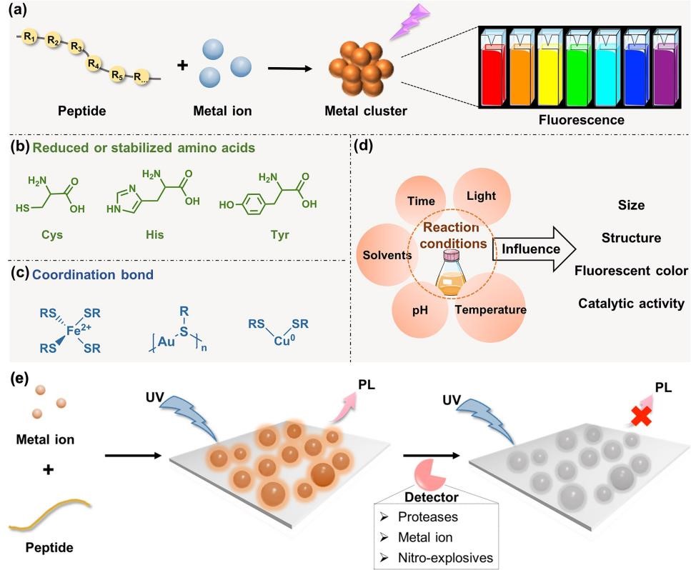 多肽能够诱导金、银等离子矿化形成尺寸、结构精确可控的纳米团簇或者胶体颗粒,并作为活性组分吸附在纳米团簇/颗粒的表面。形成的多肽-金属胶体颗粒,不仅具有独特的光学活性(荧光、圆偏振吸收/发射、表面等离子体共振吸收)、催化活性,而且还具有酶响应特性以及多种特异性识别能力(图4)。通过裸眼或者光谱仪检测多肽-金属胶体颗粒溶液或者薄膜的光学性质的变化,可实现对多种活性物质,包括肿瘤标志物、金属离子、抗原等的定性和定量检测。