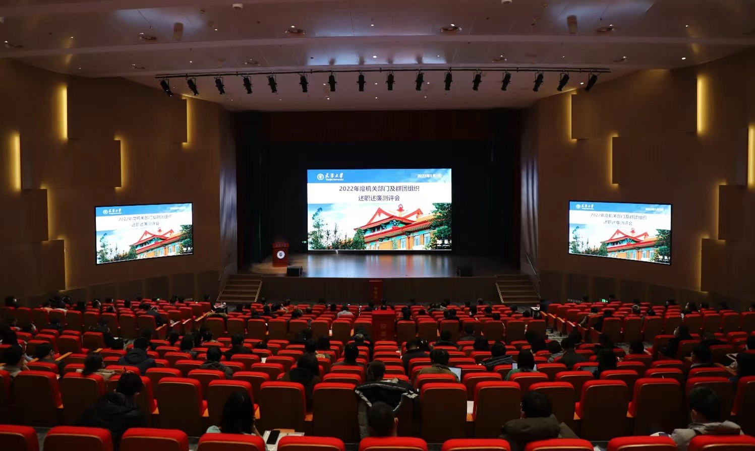 本站讯(组织部供稿 摄影程岩)近日,学校召开2022年度机关部门及群团组织述职述廉测评会,会议在北洋园校区地震大装置仿真中心一层报告厅举行。党委书记杨贤金、校长金东寒出席会议并讲话,全体校领导,党委委员、纪委委员,全体中层干部,部分市级及以上党代表、人大代表、政协委员,特邀监察员,各民主党派主要负责人,教代会代表以及学生代表等参加了会议。会议由党委常委、常务副校长胡文平主持。
