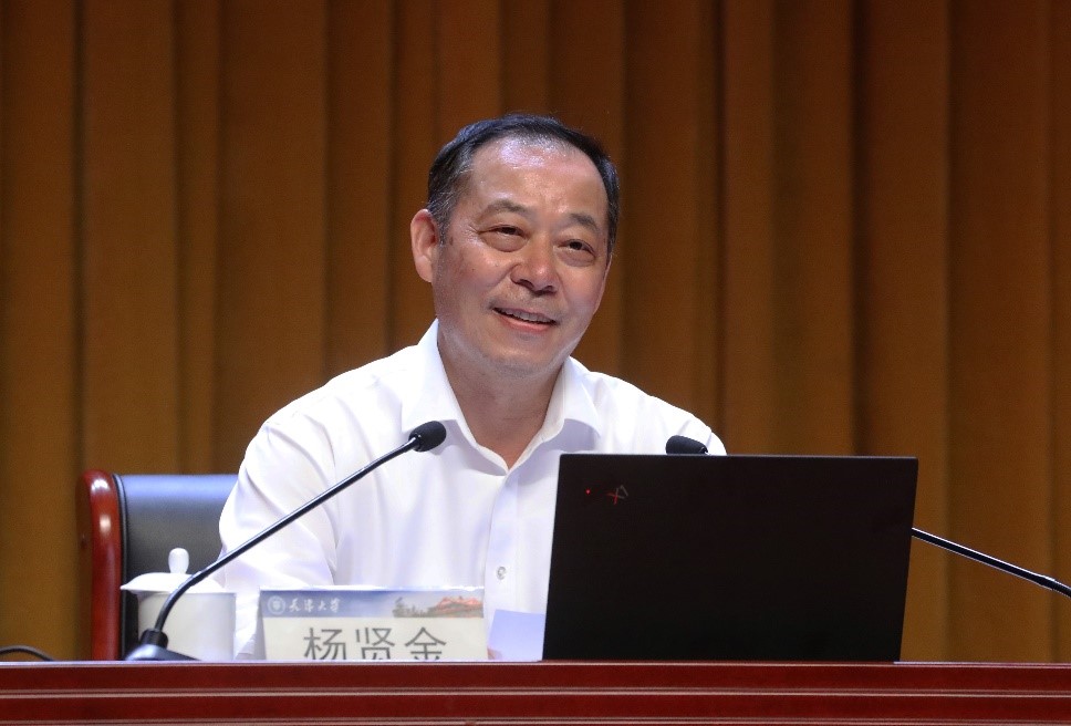 “刚刚进入大学生活,进入新的环境,存在这样那样的不适应都很正常,只要我们自己保持定力、认准目标、努力奋斗,在学校、老师和同学们的帮助下,一定能打好我们未来发展的基础。”杨贤金勉励同学们要做新时代的奋斗者,并提出了四点建议:一是坚定理想信念,要加强理论学习,坚持用科学理论武装头脑;要坚定不移听党话、跟党走,把对祖国血浓于水、与人民同呼吸共命运的情感贯穿学业全过程、融汇在事业追求中;要自觉培育和践行社会主义核心价值观,踏踏实实修好品德,成为有大爱大德大情怀的人。二是筑牢成才根基,要打好面向未来的知识基础,掌握系统的科学文化知识、成熟的实践技能、创新的思维方法,努力成为高水平复合型人才;要传承严谨治学的精神,保持学习的加速度,有效增长知识和见识;要保持专注的态度,相信一分耕耘一分收获的“汗水哲学”,踏踏实实一步一个脚印的努力,用确定的努力面对充满不确定的未来。三是多读书多思考,要培养独立思考的能力,不能把局部当作整体,也不能把别人的观点当作事实,看到热点事件不要马上跟评转发、发表评论,要“让子弹再飞一会”,把情况摸清楚之后再做出评价和判断;要坚持读书的生活方式,养成爱读书、善读书的好习惯,读具有“挑战”的、需要思考后才能理解的书。四是追求高雅情趣,把打游戏、追剧、刷短视频的时间更多地用在户外运动、健身锻炼、音乐鉴赏、艺术创造这些更加有益身心的活动上,找到一门一生热爱的文艺爱好,打造诗情画意的精神世界,找到一项一生坚持的体育项目,养成每天锻炼一小时的好习惯,拥有一副健康强健的好身体,“努力为祖国健康工作五十年”。杨贤金鼓励青年学子要以最优秀的姿态迎接未来,不负党和人民的期望,不负学校的培养,有本领、有底气、有自信接过民族复兴的接力棒,勇担使命、求真力行,跑出一个好成绩。
