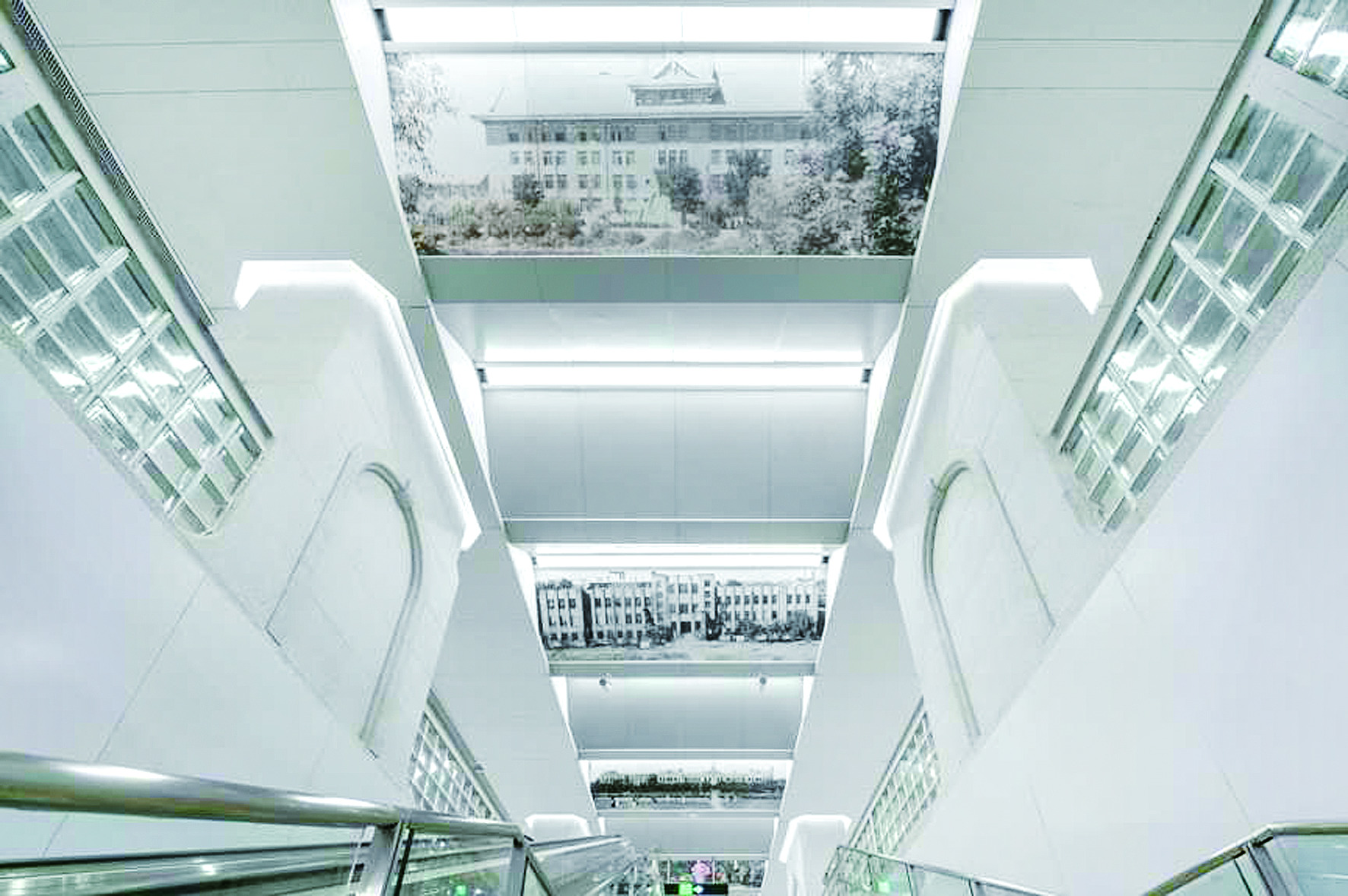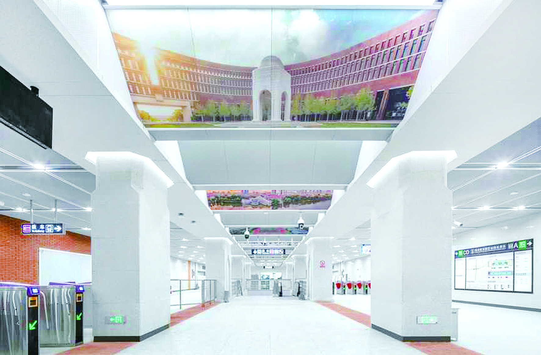 宽敞的站厅旁边,一幅天大建筑图占满了整个墙壁,这是车站站厅层艺术墙。空间上,从远及近,它向大家展示了天大卫津路校区和北洋园校区的校园风貌。抬头瞧,楼梯、走廊的站厅层中路顶棚上,都是天大各时期风格的建筑图片,尽显《巍巍学府 源远流长》——包括“北洋大学堂”“海小棠”“大操场”“第九教学楼”“北洋园校区东门”“第32教学楼”“天大教学楼群”“北洋园校区俯瞰”“校训石”……在地铁站的C出入口通道,左侧展示了天大从1895年北洋大学堂成立始至今的大事记,右侧展示了多位知名校友和掌校人的故事,如革命先驱张太雷及梁桥专家茅以升等。穿过通道就让人仿佛穿梭于天津大学浩瀚的历史长河中。