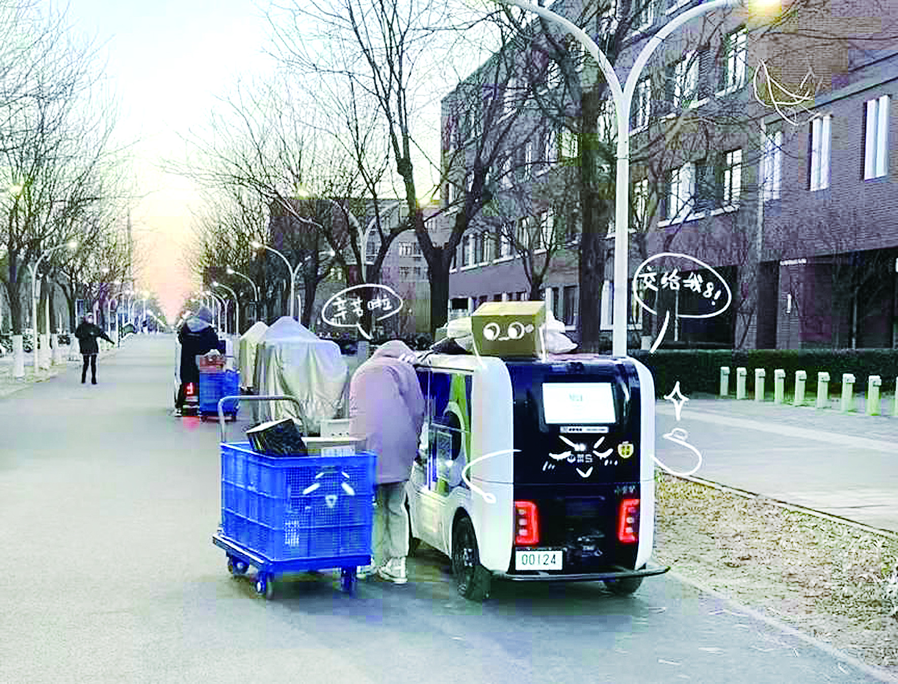 2年来,天大校园中出现了无人快递小车,让师生们眼前一亮。在宿舍楼、教学楼、食堂、湖边,随时可以看到无人快递小车,被好奇的大家举起手机拍照。小车的日常台词是:“您预约的快递无人车已到达指定地点”“x号柜门已打开,请取走您的包裹”“里面还有他人的包裹,请勿拿错哦”……