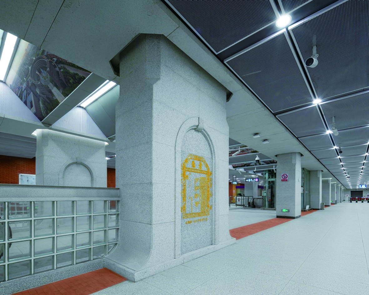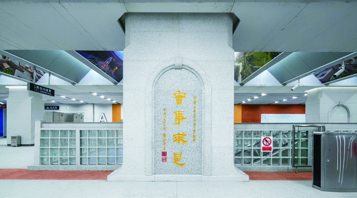 走进“海河教育园区站”,楼梯周边的4个立柱以天大地标建筑北洋纪念亭为主要设计原型,分别包含以下设计元素:天津大学校徽、校歌、校训和中国第一张大学文凭——钦字第一号《考凭》……