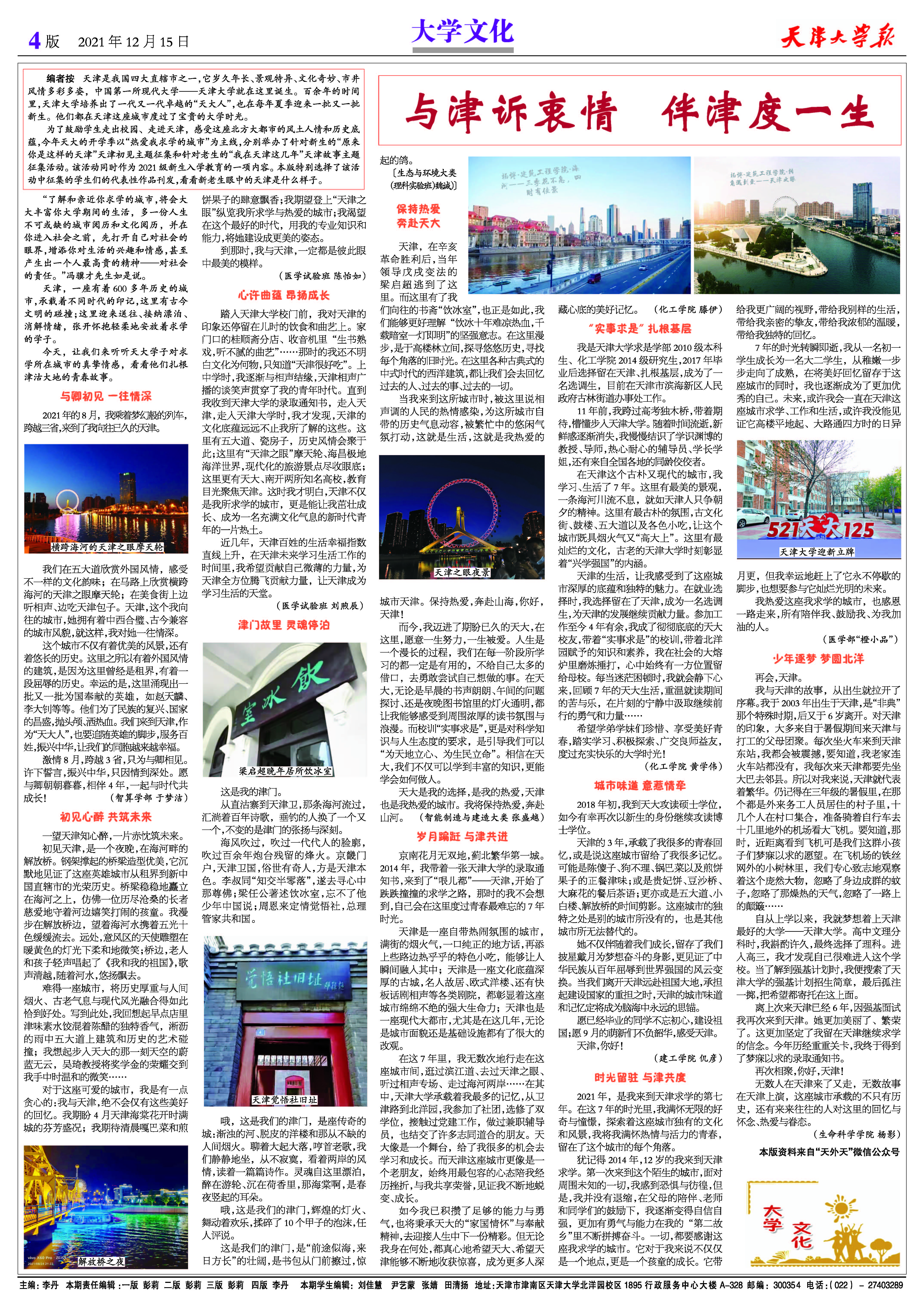 为了鼓励学生走出校园、走进天津,感受这座北方大都市的风土人情和历史底蕴,今年天大的开学季以“热爱我求学的城市”为主线,分别举办了针对新生的“原来你是这样的天津”天津初见主题征集和针对老生的“我在天津这几年”天津故事主题征集活动。该活动同时作为2021级新生入学教育的一项内容。本版特别选择了该活动中征集的学生们的代表性作品刊发,看看新老生眼中的天津是什么样子。