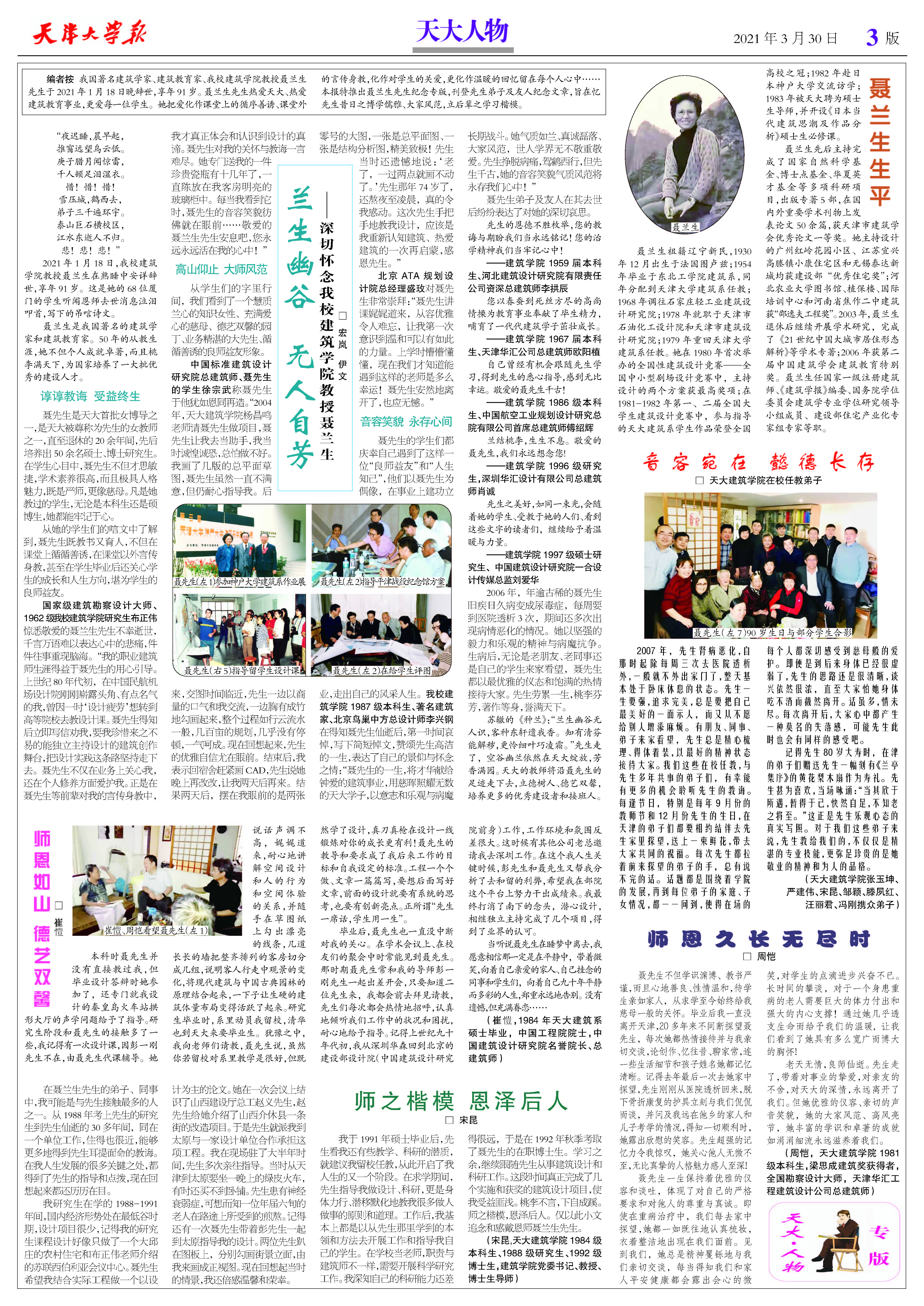 我国著名建筑学家、建筑教育家、我校建筑学院教授聂兰生先生于2021年1月18日晚辞世,享年91岁。聂兰生先生热爱天大、热爱建筑教育事业,更爱每一位学生。她把爱化作课堂上的循序善诱、课堂外的言传身教,化作对学生的关爱,更化作温暖的回忆留在每个人心中……本报特推出聂兰生先生纪念专版,刊登先生弟子及友人纪念文章,旨在忆先生昔日之博学儒雅、大家风范,立后辈之学习楷模。