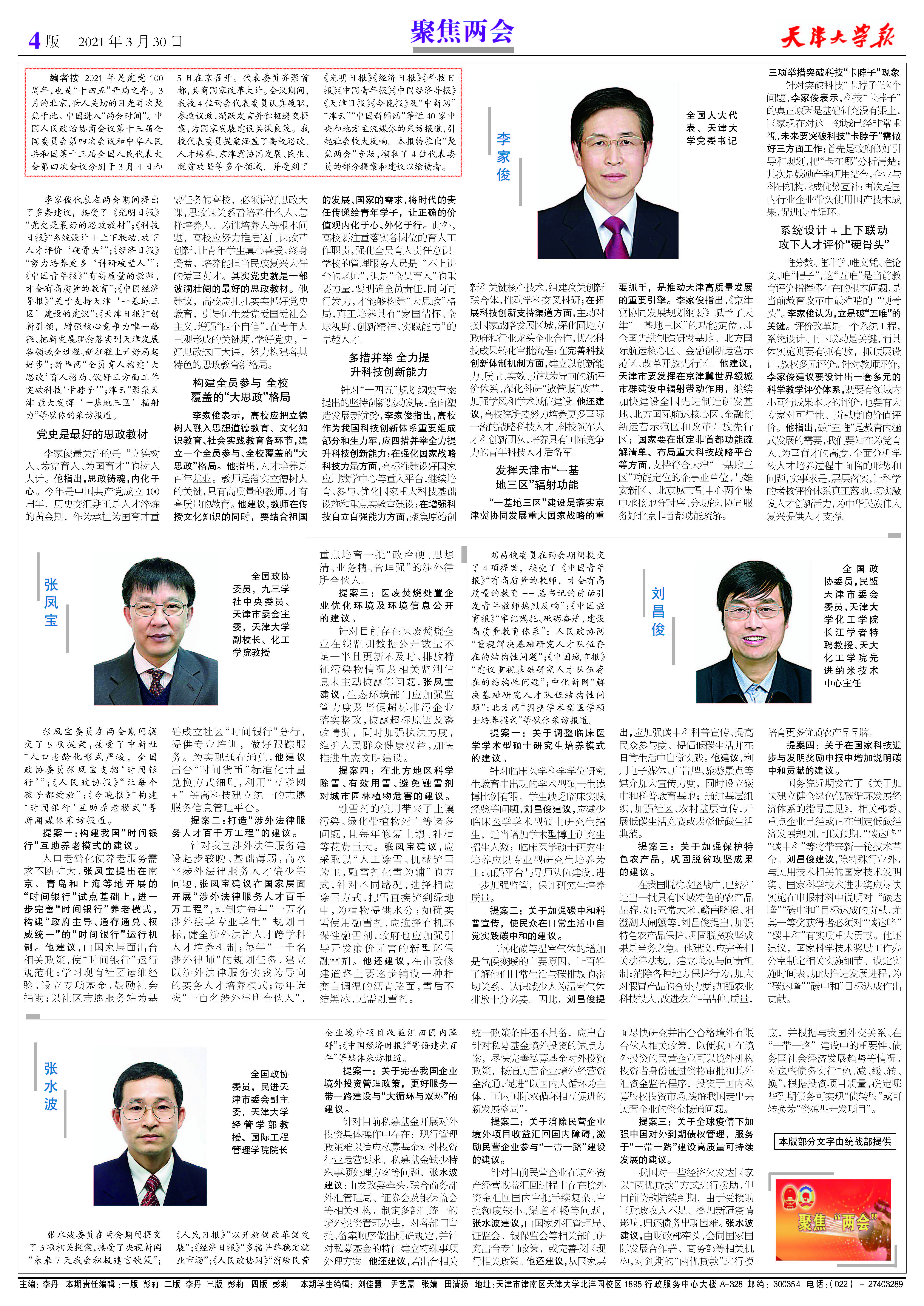 2021年是建党100周年,也是“十四五”开局之年。3月的北京,世人关切的目光再次聚焦于此。中国进入“两会时间”。中国人民政治协商会议第十三届全国委员会第四次会议和中华人民共和国第十三届全国人民代表大会第四次会议分别于3月4日和5日在京召开。代表委员齐聚首都,共商国家改革大计。会议期间,我校4位两会代表委员认真履职,参政议政,踊跃发言并积极递交提案,为国家发展建设共谋良策。我校代表委员提案涵盖了高校思政、人才培养、京津冀协同发展、民生、脱贫攻坚等多个领域,并受到了《光明日报》《经济日报》《科技日报》《中国青年报》《中国经济导报》《天津日报》《今晚报》及“中新网”“津云”“中国新闻网”等近40家中央和地方主流媒体的采访报道,引起社会较大反响。本报特推出“聚焦两会”专版,撷取了4位代表委员的部分提案和建议以飨读者。
