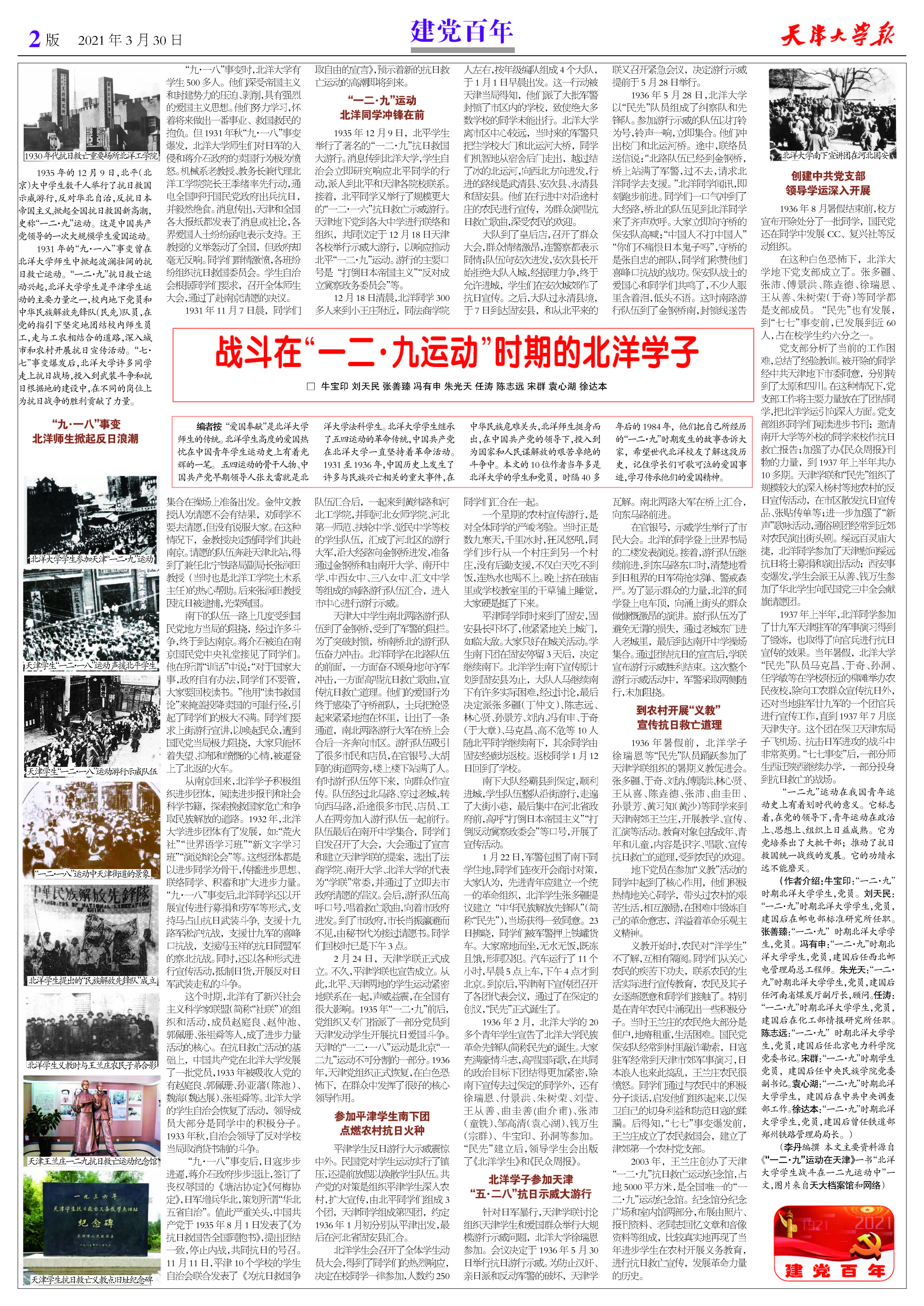 “爱国奉献”是北洋大学师生的传统。北洋学生高度的爱国热忱在中国青年学生运动史上有着光辉的一笔。 五四运动的骨干人物、中国共产党早期领导人张太雷就是北洋大学法科学生。北洋大学学生继承了五四运动的革命传统,中国共产党在北洋大学一直坚持着革命活动。1931至1936年,中国历史上发生了许多与民族兴亡相关的重大事件,在中华民族危难关头,北洋师生挺身而出,在中国共产党的领导下,投入到为国家和人民谋解放的艰苦卓绝的斗争中。本文的10位作者当年多是北洋大学的学生和党员,时隔40多年后的1984年,他们把自己所经历的“一二·九”时期发生的故事告诉大家,希望世代北洋校友了解这段历史,记住学长们可歌可泣的爱国事迹,学习传承他们的爱国精神。