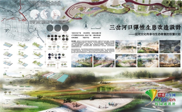 生态文明组选取三岔河口作为研究对象,在进行前期调研和水质调查后结合定性定量,最终进行弹性改造设计。整体从文化遗产与弹性生态角度出发,按照调查研究、问题分析、策略提出、分析方案设计、节点及剖面详细设计的逻辑思路,通过空间、景观、技术等的重构和置入,以期延续运河文化传承、修复运河生态韧性、激活两岸活力。