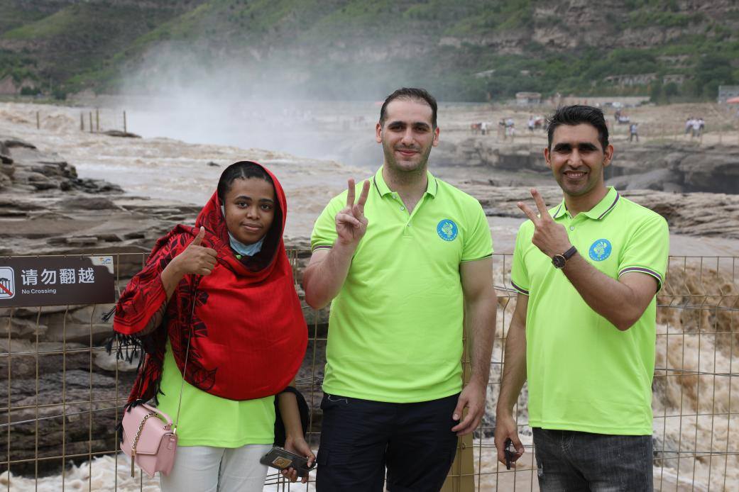 离开了黄帝陵,留学生们一路向东来到了黄河边上,这里可以看到著名的壶口瀑布。这里的河水从两岸倾泻而下,河口收束宛如壶口一般,气势奔腾汹涌。来自科摩罗的齐琪格平时喜欢阅读古诗。望着奔流的河水,她不禁吟起了“黄河之水天上来,奔流到海不复回”的经典诗句,表达自己的激动之情。