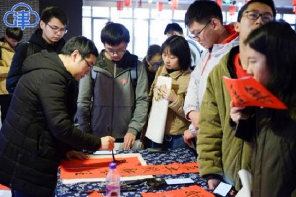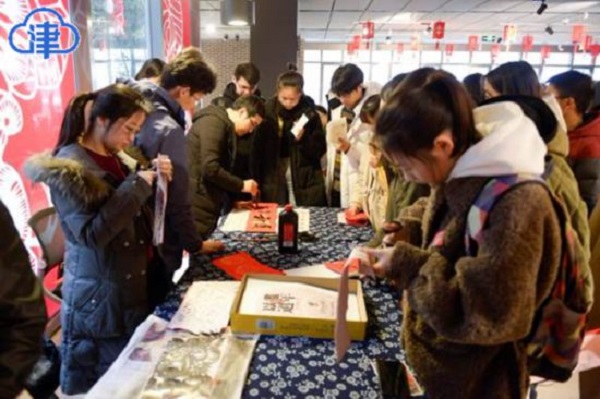 开幕式当天,天津杨柳青年画传承人霍秀英、霍庆顺、霍庆有和天津剪纸传承人许志齐应邀而来,现场演示精湛技艺。同学们纷纷上前与传承人交流,亲自动手学印年画、剪窗花。天津大学新竹书画社也摆出笔墨纸砚,为大家书写春联。故宫原宫廷部主任苑洪琪和北京师范大学教授萧放也专程来津,带来“宫里过大年”和“民间过大年”两场主题报告。清宫里的皇家年夜饭怎么吃?老百姓过年的习俗到底是怎么回事儿?听了两位专家精彩的报告,同学们大呼“涨姿势”!据悉,展览将持续展出至2020年春季。