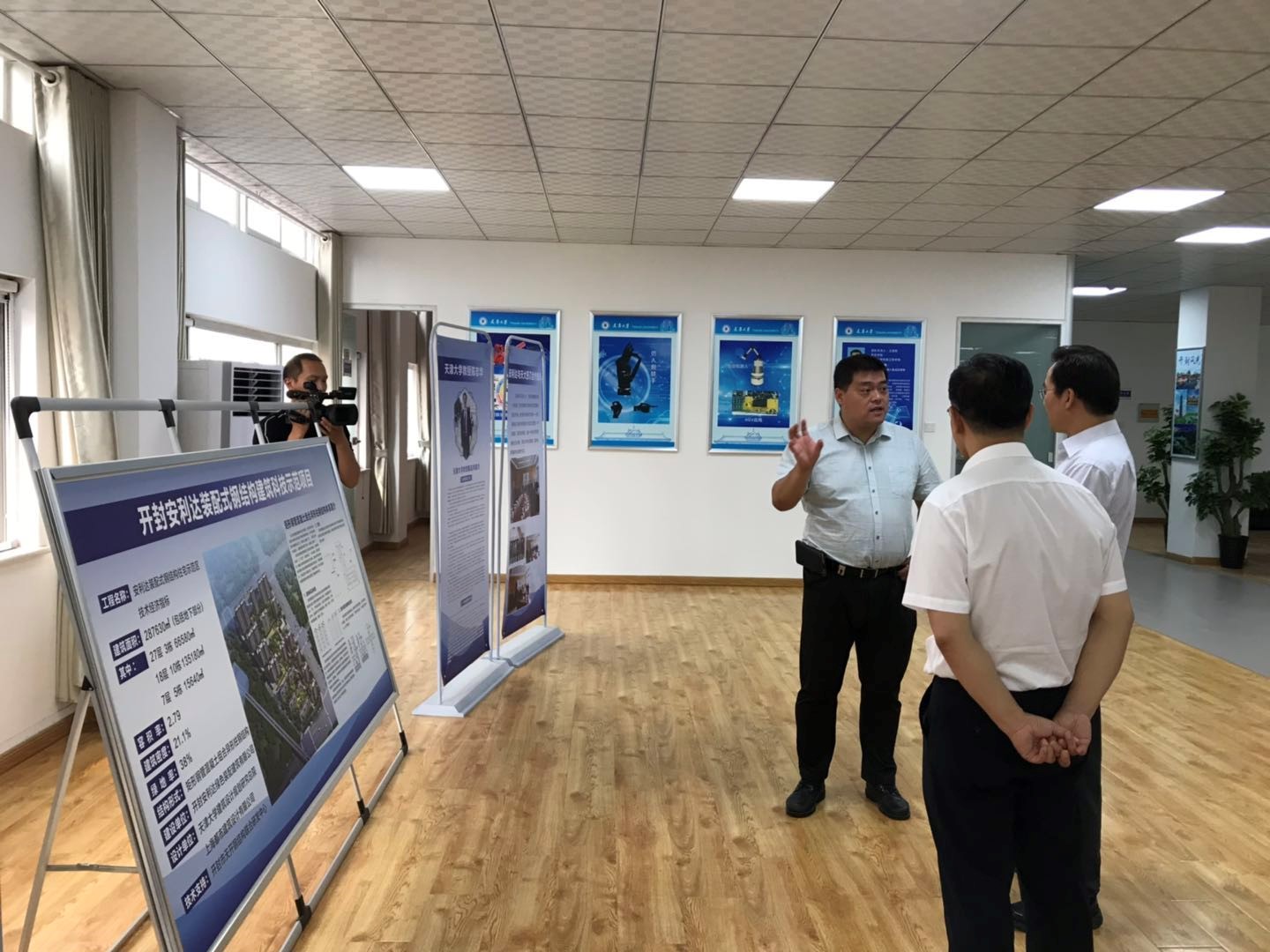 孔昌生部长一行听取了关于钢结构团队在当地开展的装配式钢结构建筑科技示范项目的汇报,询问了该项目的进展情况,详细了解了钢结构建筑抗震性好、结构可靠性高、室内空间大和施工过程污染少等技术优势,孔昌生对天津大学钢结构团队与当地企业长期卓有成效的合作表示赞赏。孔昌生一行在无人机展品前驻足,对我院航空航天团队研制的新型油电混合动力无人机表现出浓厚的兴趣,认为该技术在森林防火、勘察和航拍等领域应用前景广阔。随后又参观了文化创意团队的“样式雷”展品,该展品体现了天大建筑对历史文化的传承,王磊介绍了研究院与开封文物局在古建筑保护方面的合作,孔昌生详细询问了该团队最新科技成果“火灾早期检测技术”的原理及技术实施方案。最后还参观了天津大学与奇瑞汽车共建的“震动与乘坐舒适性联合实验室”。