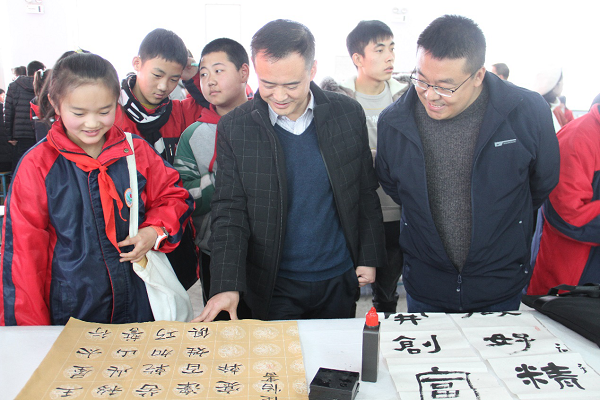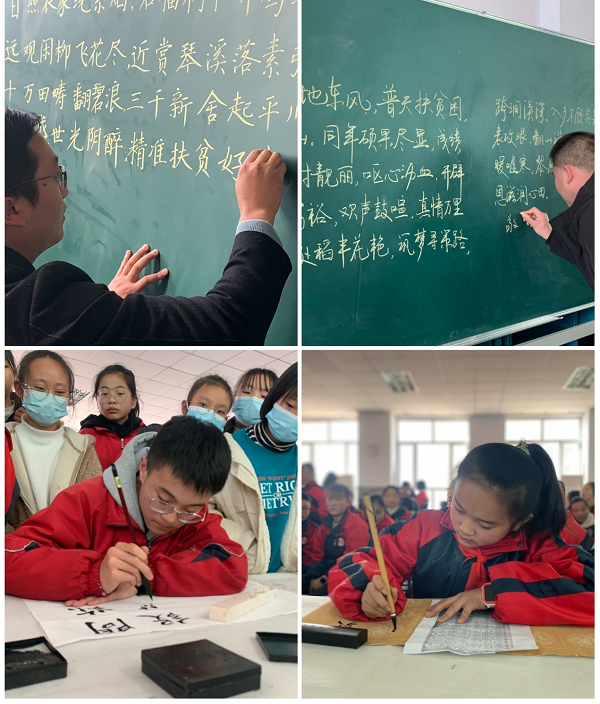 颁奖仪式后,获奖师生围绕主题进行现场创作展演,师生们沉思斟酌、抚纸蘸墨、挥毫落纸,一幅幅优秀作品一挥而就。或轻舞飞扬、飘逸洒脱,展现粉笔字的魅力;或小小方格,圆转流美,雄健有力,挥洒钢笔书写之豪气;或气质敦厚,或雍容大方,或端正俊丽,或运笔纯正,尽显毛笔的洒脱。一笔一画、一点一顿间,一首首脱贫攻坚的赞歌从师生们的笔尖流淌而出。出席活动的领导和嘉宾现场观摩了创作展示,并和书法爱好者进行交流、交谈。