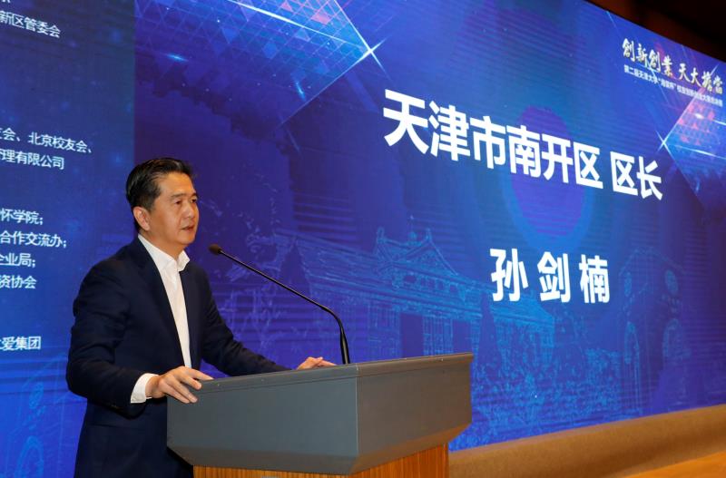 孙剑楠代表南开区政府对总决赛的举办表示热烈祝贺。他表示,天津大学是支撑天津创新发展的强大的智力源泉和南开区高质量发展的重要引擎。此次决赛项目既触及科技前沿,又直面人民需求,体现了天津大学兴学强国、实事求是的担当。南开区对其中优秀项目将给予重点支持和关注,同时为更多企业家提供更大发展空间和最佳服务保障。希望更多创新精英选择并投资南开,在此创新创业,共同促进南开区发展。