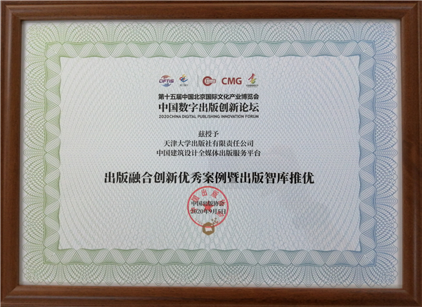 本站讯(通讯员 王硉)2020年9月5日,2020(第四届)中国数字出版创新论坛在京举行。论坛公布了“出版融合创新优秀案例暨出版智库优秀推广案例”评审结果,天津大学出版社有限责任公司的“中国建筑设计全媒体出版服务平台”数字出版项目作为建筑专业领域优秀案例获此殊荣。据悉,全国53家单位共有61个项目入选。本届论坛由中国出版协会、北京市委宣传部、中国新闻出版传媒集团、北京市贸促会、中国会展经济研究会联合主办。