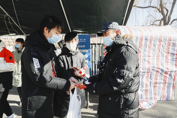 于是记者团和北洋之声的小伙伴们行动了,他们为在校门值守的保安小哥哥和老师志愿者们送上了热水和发热贴。