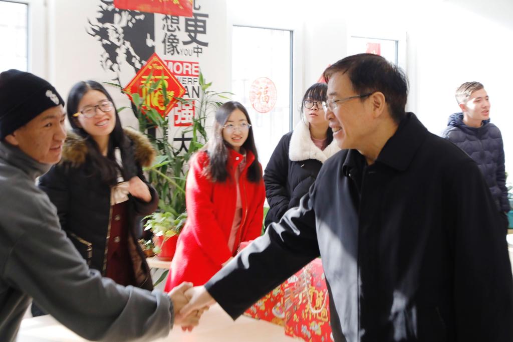 李家俊一行首先来到格园二斋宿舍楼,学校在这里为寒假留校学生安排了集中住宿。李家俊与留校学生亲切交谈,仔细询问他们的假期安排,叮嘱同学们注意出行安全,把学校当成自己的家,过一个愉快而充实的春节。