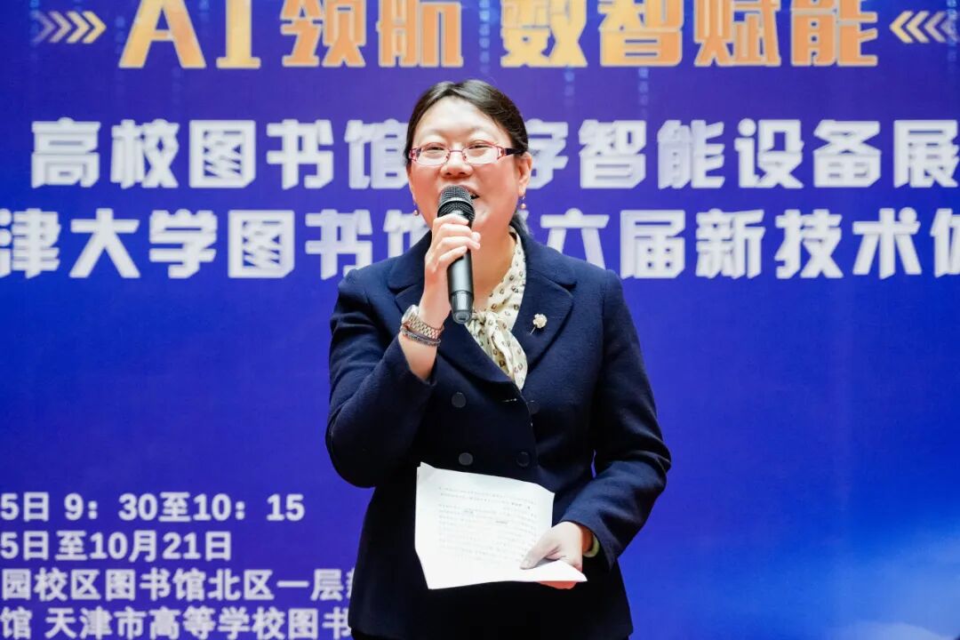 南开大学图书馆党委书记马亚男作为天津市高等学校图书情报工作委员会代表在开幕式致辞。她表示,本次活动为各高校图书馆提供了一个很好的学习、交流和共同成长的机会,希望各位同仁通过这次活动,在今后的工作中促进科技创新与高校图书馆服务模式的深度融合。最后,她代表天津市高等学校图书情报工作委员会预祝本次活动圆满成功。