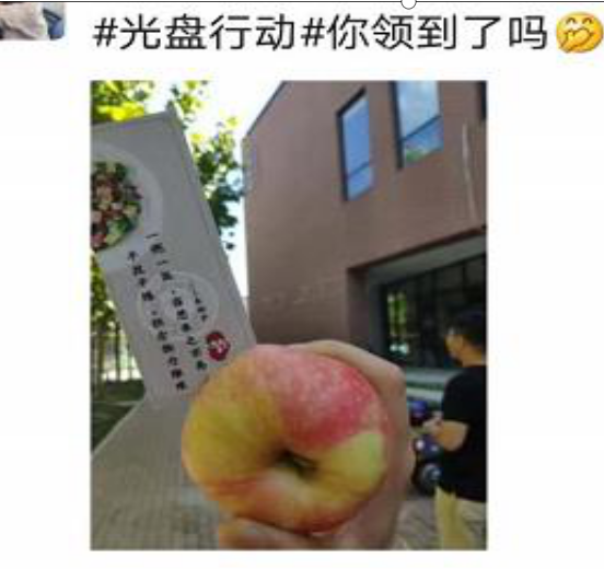 自9月3日起至10月3日,每天午餐时间,在全校各食堂开展“光盘换礼”活动。践行“光盘”的学生可以领取一张礼品兑换券,凭借兑换券到餐厅出口处领取一份新鲜水果和书签,以此鼓励学生节约粮食,拒绝“舌尖上的浪费”。