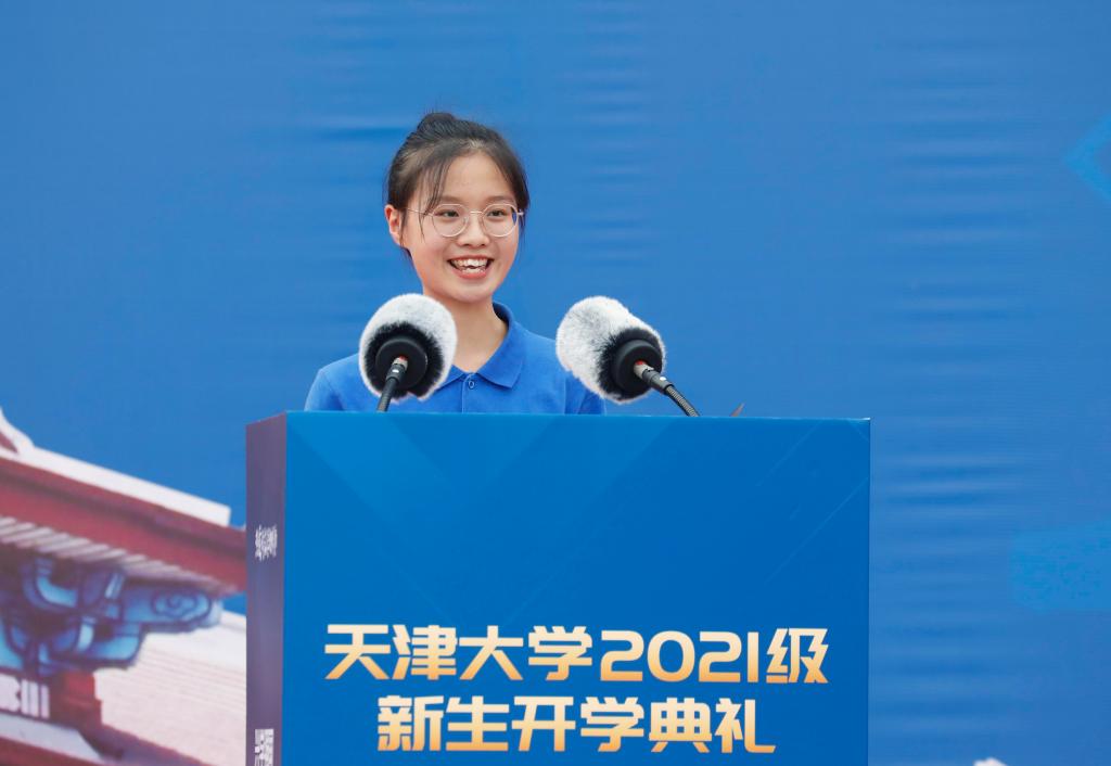 新生代表马千越在2021年天津大学卫津路校区新生开学典礼上发言
