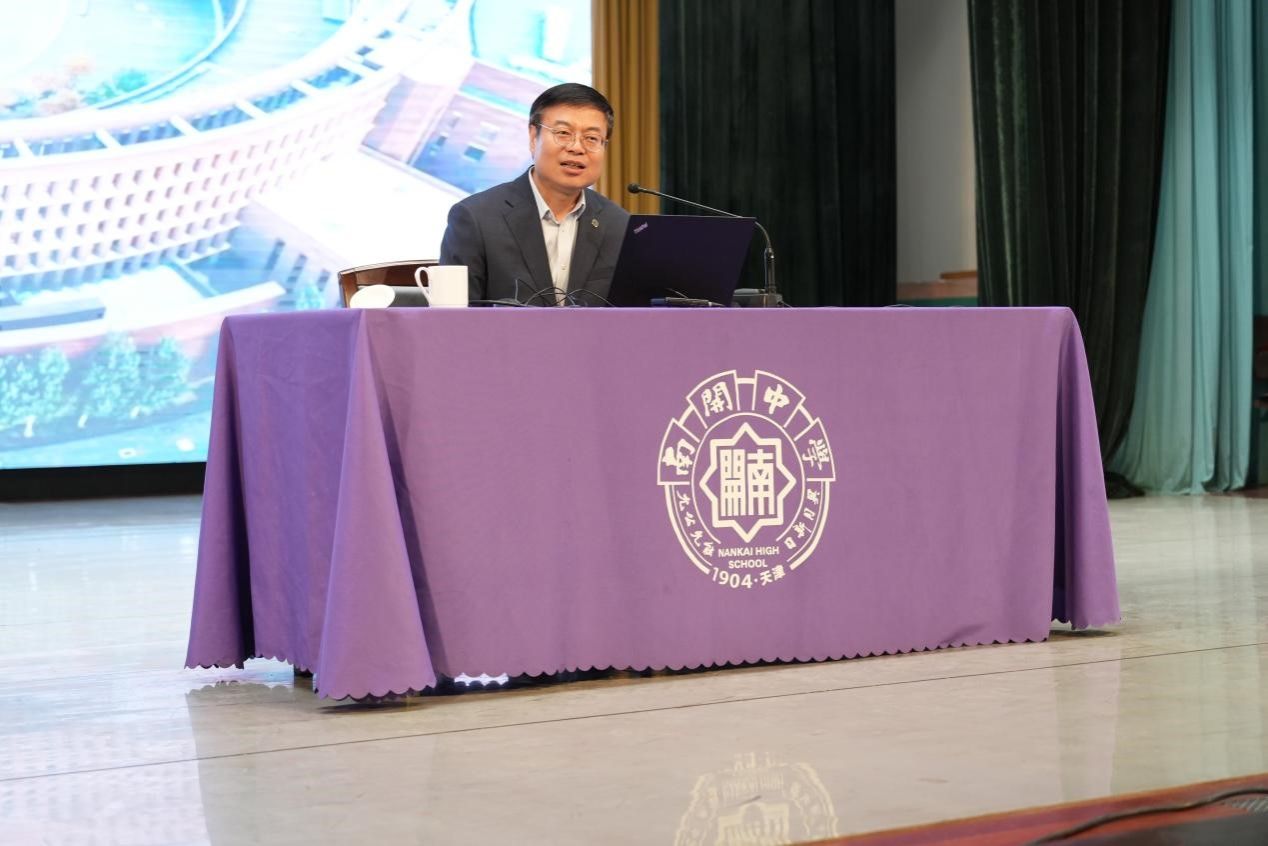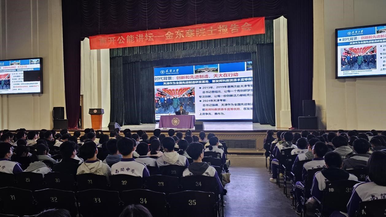 本站讯(教务处招生办公室供稿)3月12日下午,中国工程院院士、天津大学校长金东寒应邀赴天津市南开中学,以“绿色动力助力实现双碳目标”为题,为600余名南开学子作科普报告。南开中学理事长孙海麟、南开中学党委书记李轶、南开中学校长刘浩陪同出席,天津大学党办校办、教务处负责同志陪同参加。科普报告会由南开中学校长刘浩主持。