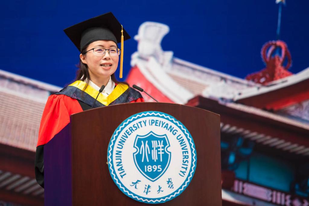 “同学们还记得四年前是哪一天来到天大的吗?是2019年8月28日。那天我一大早儿就等在迎新帐篷,期待你们的到来!”材料学院王颖老师作为教师代表回忆了四年来与同学们朝夕相处的难忘点滴,她深情寄语学子,虽然结束了本科生涯,但是每个人都有一个终身课题,那就是成长,她希望同学们能够始终保持正确的方向、始终保持乐观积极的人生态度、始终为自己赋能。“就要说再见了,那么就让我在你临别的行囊中,放一份担当、一缕阳光和一泓清泉吧。选择了为国担当,就选择了正确的方向;心中有阳光,前进路上就拥有了战胜挫折的光芒;源泉混混,不舍昼夜,保持终身学习的澎湃能量,必将跑出新时代天大人的昂扬!”