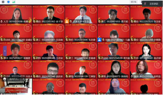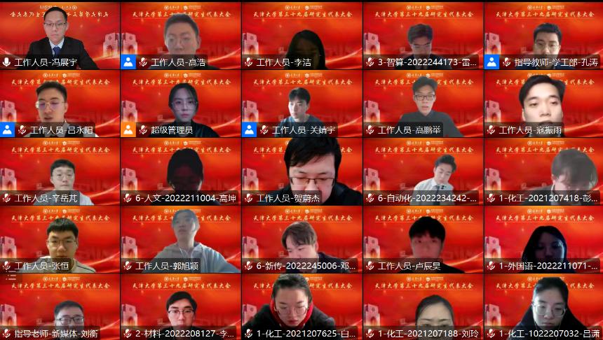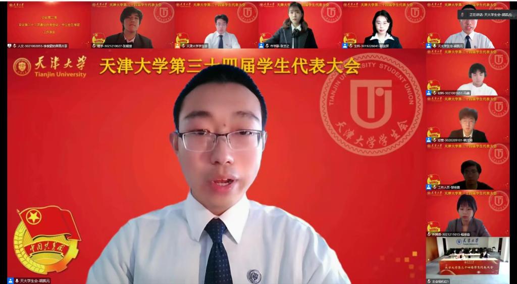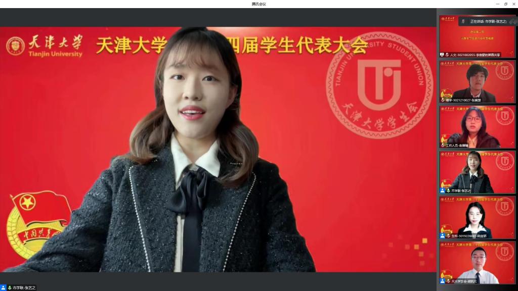 2023年1月7日至8日,天津大学第三十四届学生代表大会、第三十九届研究生代表大会以线上线下相结合的形式召开,学工部、校团委相关负责人以及会议工作人员在北洋园校区行政楼线下会场参会,各院级学生会、研究生会指导教师、学生代表、研究生代表线上参会,天津市学联主席张艺之应邀参会。