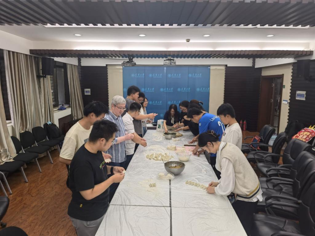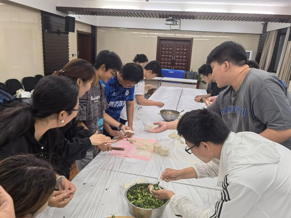 当天一大早,老师们提前准备好面粉、馅料、擀面杖等食材工具,与同学们一起动手擀面、调馅、包饺子,在轻松愉悦的氛围中聊生活、话家常,增进师生间的感情。