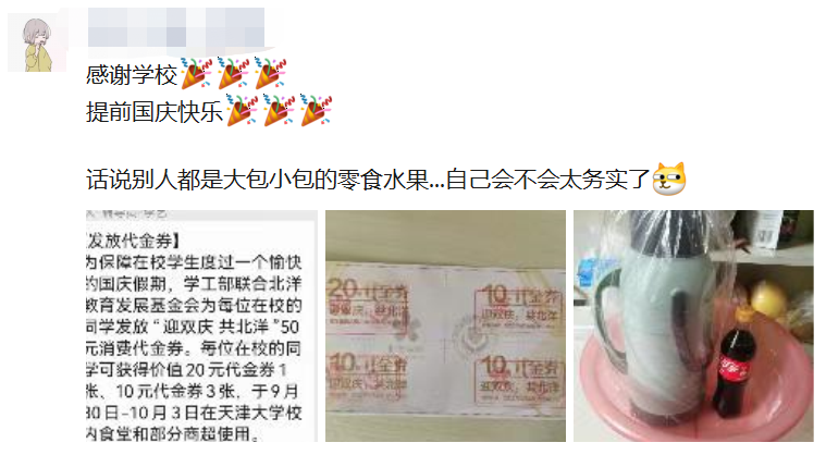 本站讯(学生记者梁铭宸)庆国庆、迎校庆,中华人民共和国成立73周年之际,天津大学也将迎来自己127岁生日。校园里,每一名“双喜临门”的天大学子都收获了一份别样的小惊喜——“迎双庆、共北洋爱心券”。这样“能处”的母校得到了同学们交口称赞,大家纷纷表示——“爱心券与小长假更配哟!”