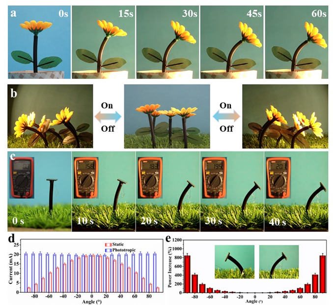 “作为概念验证演示,我们用这种新材料制备了一个‘仿生向日葵’,它能够实时迅速追踪不断变化的非聚集光源。”封伟教授说,