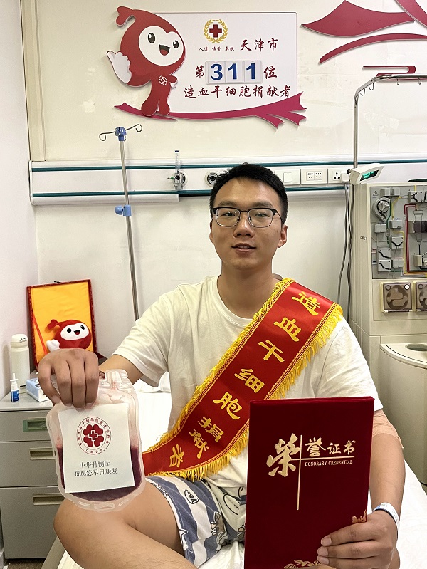 孟庆昊是天津市第311位、也是天津大学第15位造血干细胞捐献者。2018年,孟庆昊偶然了解到造血干细胞对血液病患者的重要意义,于是毅然加入捐献志愿者队伍中,时刻准备为救助生命贡献自己的力量。去年年底,天津红十字会打来的电话告诉他与一名患者初筛配型吻合,今年5月,孟庆昊开始入院为捐献做准备,前后五天共注射了9支动员剂来增加体内造血干细胞含量,经过了三小时漫长的采集过程,成功捐献造血干细胞。